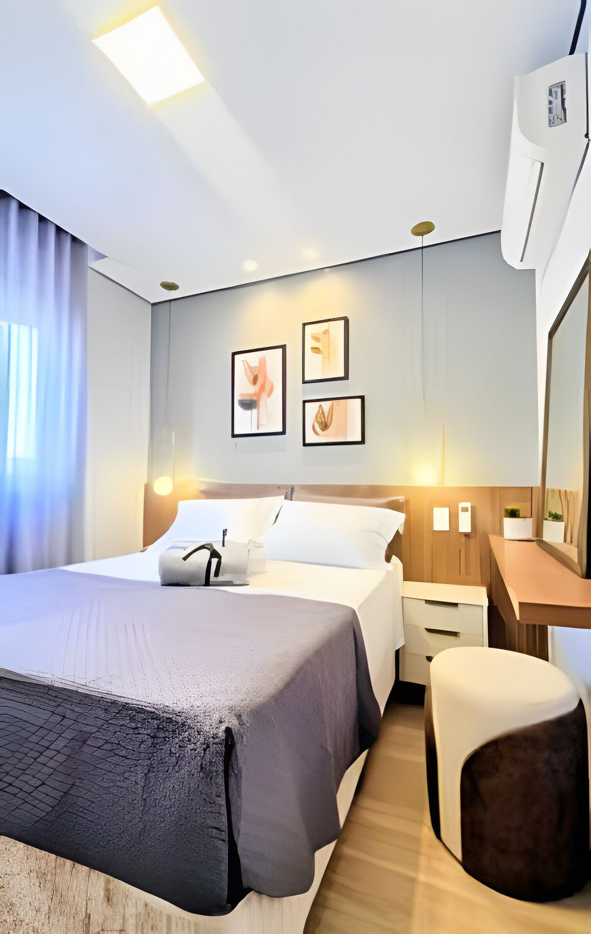 A iluminação foi projetada para que você tenha conforto e aproveite toda a luz natural que o apartamento também proporciona. No quarto, você encontrará uma espaçosa cama com enxoval de 400 fios, quatro travesseiros, almofadas e roupa de cama sempre impecável e confortável, para uma sensação relaxante e luxuosa, em todas as nossas hospedagens a roupa de cama é sempre higienizada por lavanderia profissional garantindo a qualidade do seu conforto,