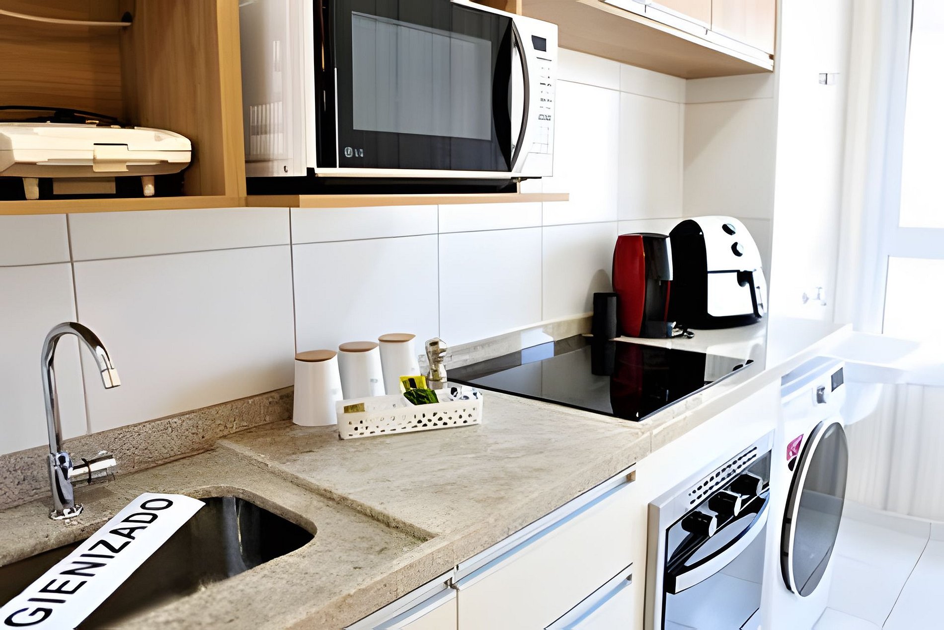 Cozinha Completa com louças, talheres, panelas, cafeteira elétrica Dolce Gusto, microondas, Lava e Seca Roupas, geladeira, fogão e forno elétricos.